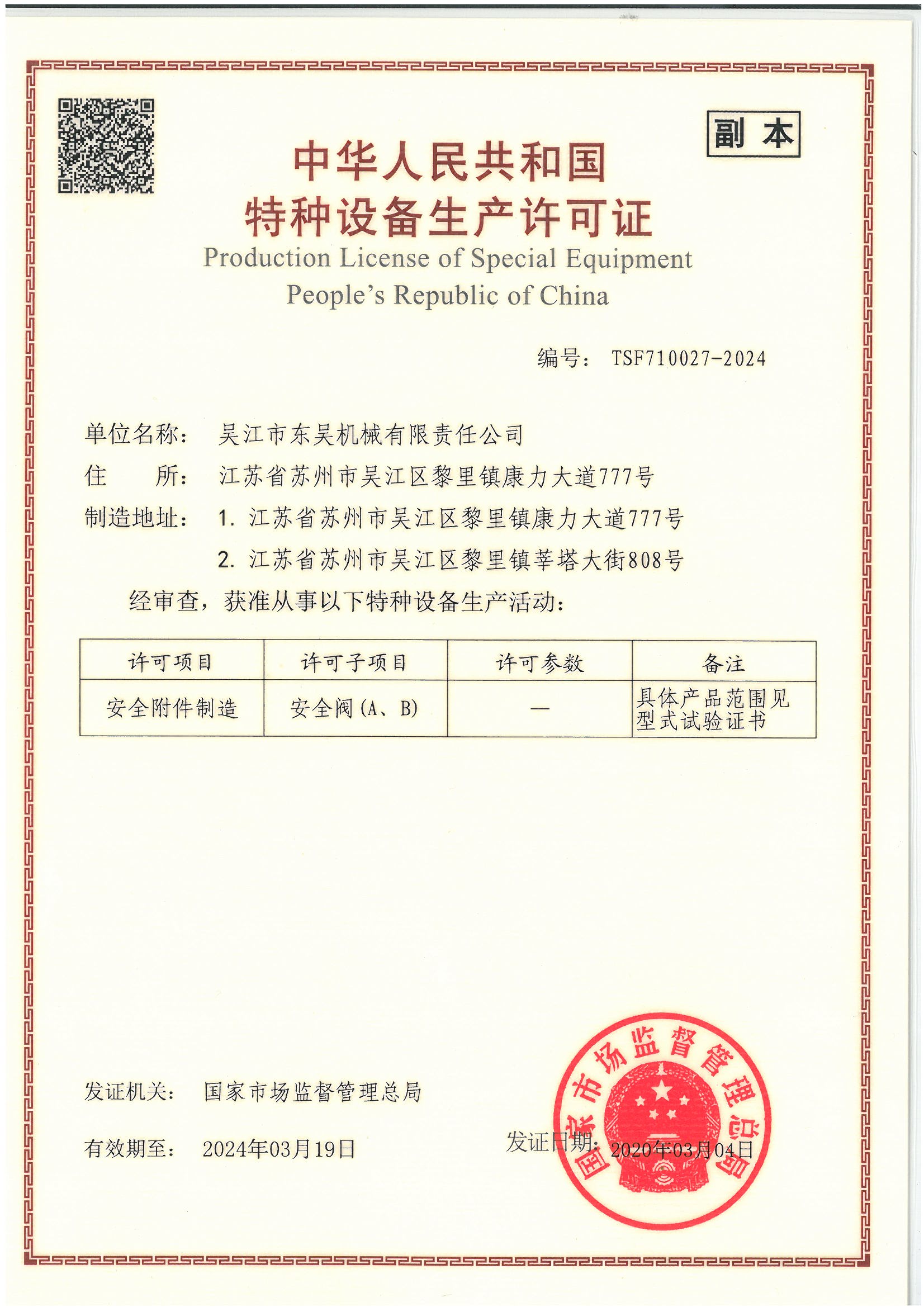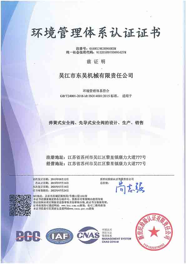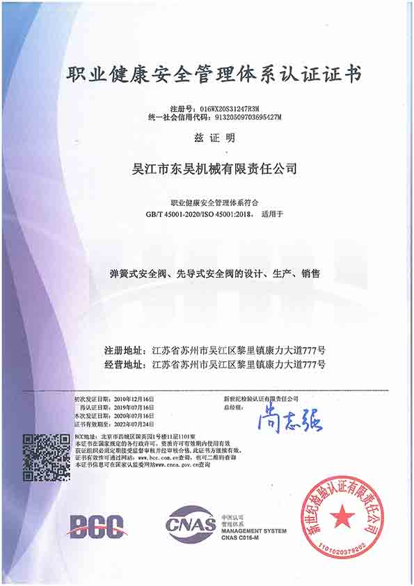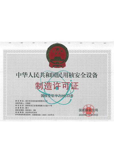 東吳機械是全國第一批擁有機電部安全閥生產許可證的單位,公司于2002年05月取得《中華人民共和國特種設備制造許可證》。然后于2004年9月獲得國家核安全局頒發(fā)的《中華人民共和國民用核安全設備設計許可證》和《中華人民共和國民用核安全設備制造許可證》。1998年公司在通過ISO9001質量體系認證的基礎上,相繼取得了ISO14001環(huán)境管理體系證書、ISO18001職業(yè)健康安全管理體系證書。2018年10月,公司又通過測量管理體系認證并取得測量管理體系認證證書。
